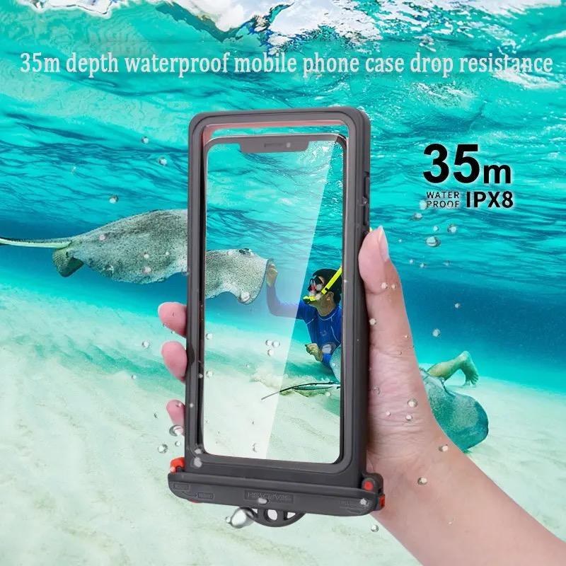 La funda impermeable para teléfono móvil ofrece protección hasta 35 metros. El bloqueo giratorio doble y el diseño de clip de cierre sellable le brindan una aventura maravillosa cuando practica deportes extremos como buceo, natación, surf.